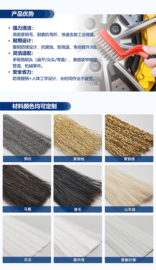 - 刷毛材質(zhì):高密度刷毛耐磨抗彎折,刷毛可選鋼絲、黃銅線、青銅線、馬鬃、豬毛、山羊絨、尼龍、聚丙烯、聚酯纖維等